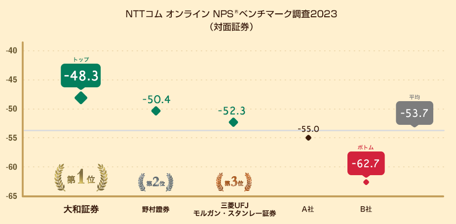 対面証券5社のうち、NPSのトップは大和証券(-48.3ポイント)、2位は野村證券(-50.4ポイント)、3位は三菱UFJモルガン・スタンレー証券(-52.3ポイント)となりました。業界全体のNPS平均は-53.7ポイント、トップ企業とボトム企業との差は14.4ポイントとなりました。