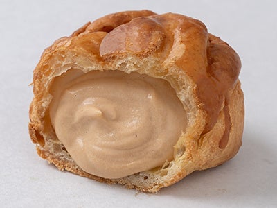 森永ミルクキャラメルの味わいをイメージした“森永ミルクキャラメルシュー”は、ビアードパパ自慢のサクサクとしたシュー生地の表面にキャラメル味をまとわせ、ミルクのコクとやさしい甘さが感じられるキャラメルクリームをシュー生地の中に詰め込みました。
