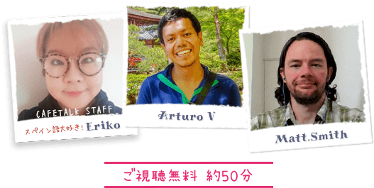 ■担当講師:Arturo V講師(https://cafetalk.com/tutor/profile/?c=eJzLMa1I9fY1jfA0DfcM18_SrrQo8CsPtLUFAF%7EXB44.&lang=ja)、Matt Smith講師(https://cafetalk.com/tutor/profile/?c=eJwrLk909fIwK3ZOSc3NDTbR9nGtCNQut7UFAGbiB9o.&lang=ja)