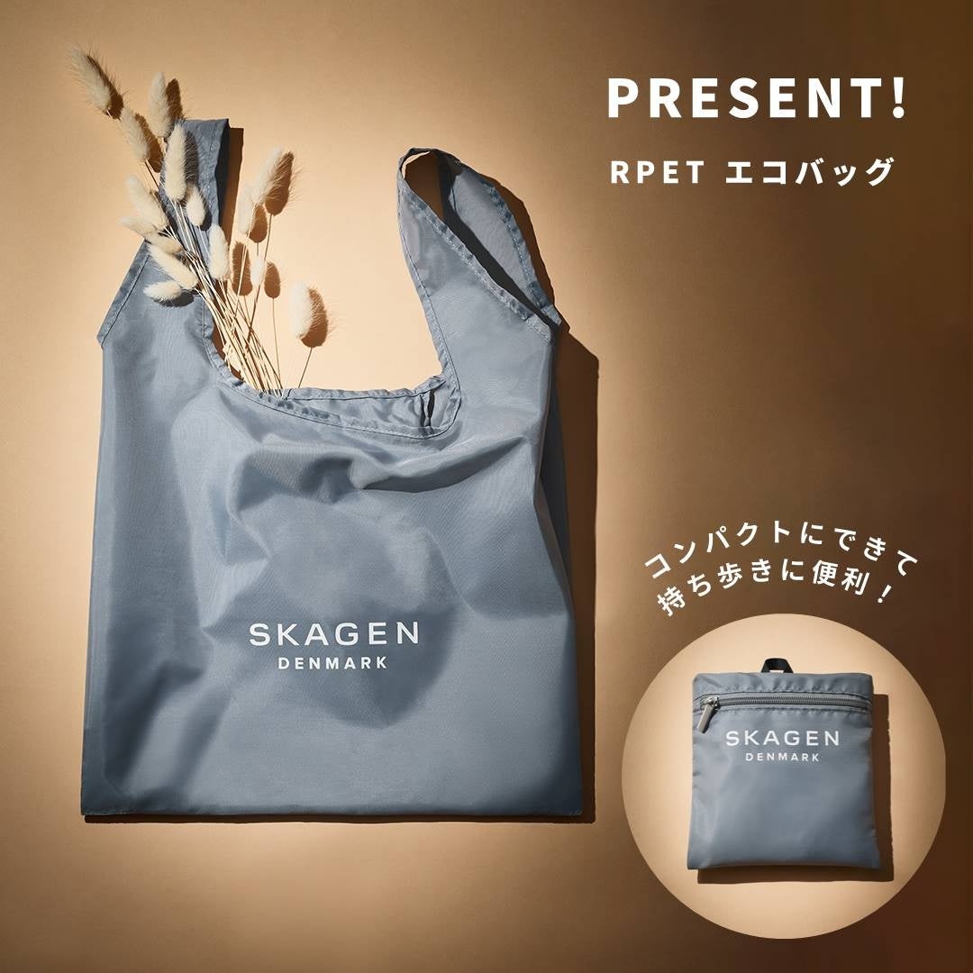 SKAGENアイテムを購入頂いた方に先着で「RPET エコバッグ」をプレゼント。地球にやさしい「RPET(リサイクルポリエステル)」を採用した、落ち着きのあるグレーカラーのエコバッグです。コンパクトに折りたたみも出来て、持ち歩きにぴったりです。
