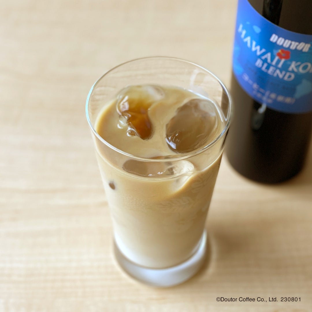 ミルクと合わせることで、コーヒーの風味が引き立ったコクのあるカフェオレが簡単に作れる希釈用リキッドコーヒーです。ドトールコーヒー直営農園のあるハワイ島コナ地区。ここで栽培された「ハワイコナ」をメインにブレンドした極深煎りのコーヒー豆を贅沢に使用し、水出しで抽出することで、深みがありながらクリアな味わいに仕上げました。