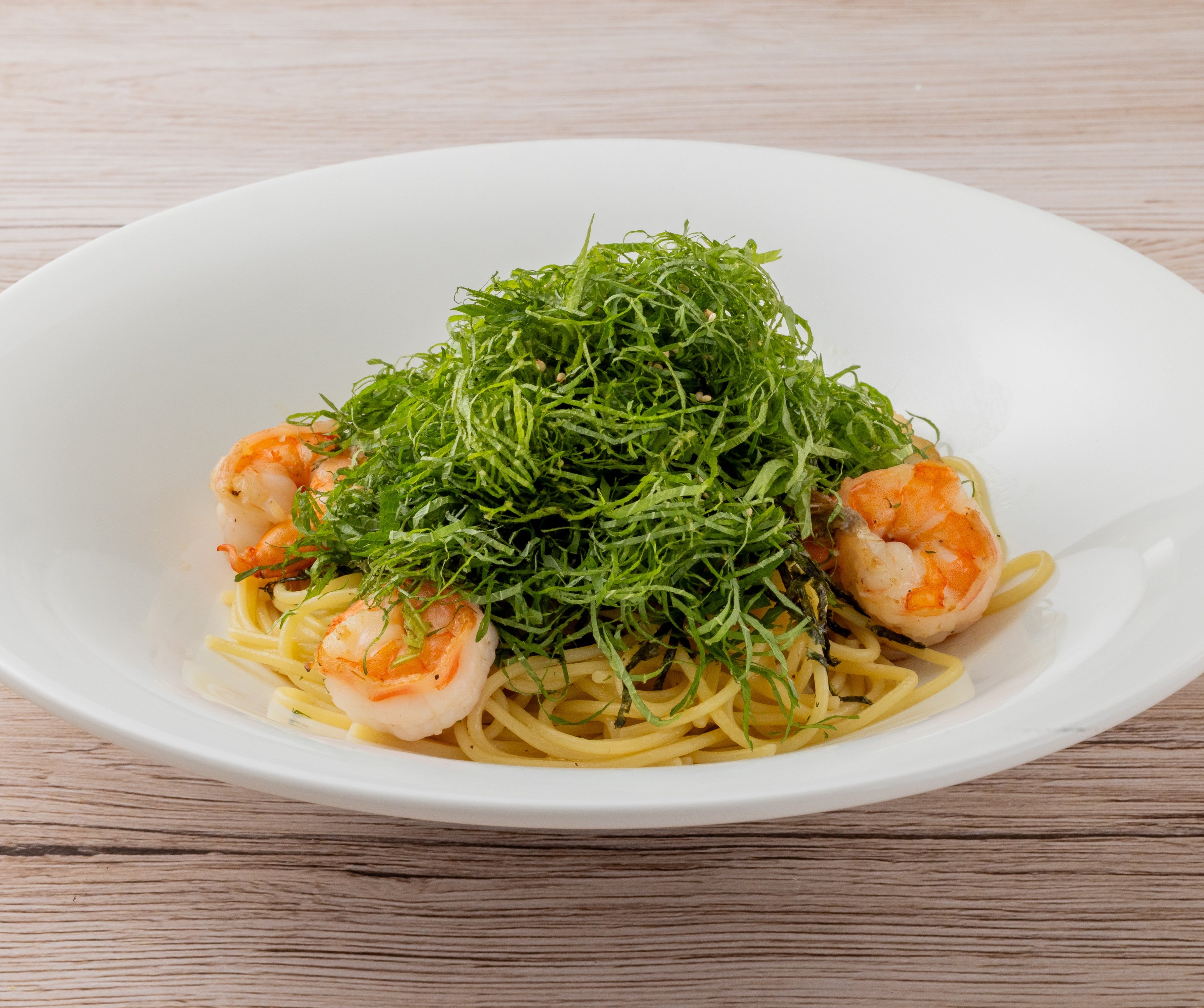 パスタメニュー:チェリートマトとバジルのトマトソーススパゲティ、海老と青じその和風スパゲッティ