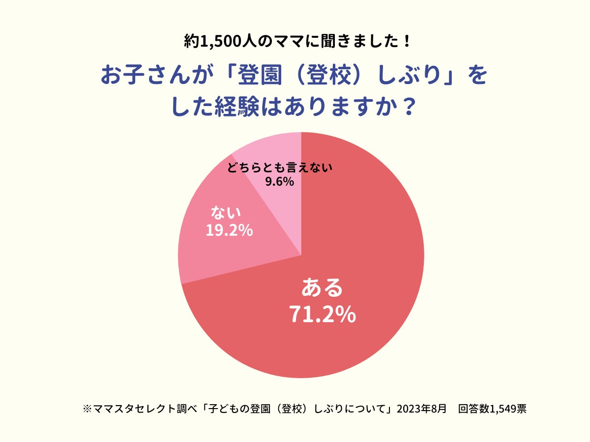 子どもの登園(登校)渋りを経験したことが「ある」と答えた人は71.2%、7割を超えました。一方で「ない」と答えた人は全体の19.2%、「どちらとも言えない」と回答した人は9.6%という結果となりました。