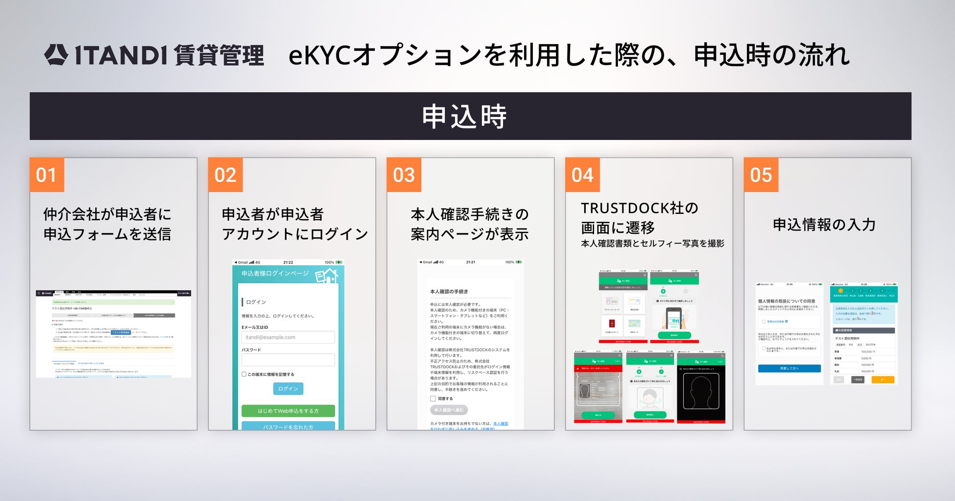 テクノロジーで不動産取引をなめらかにするイタンジ株式会社(以下「当社」)は、2025年11月より、当社が提供する賃貸管理の業務支援サービス「ITANDI 賃貸管理」の申込システムと、株式会社TRUSTDOCK (以下「TRUSTDOCK社」) が提供するeKYC(オンライン本人確認)サービス「TRUSTDOCK」を連携し、「ITANDI 賃貸管理」のオプション機能としてeKYCサービス(以下、eKYCオプション)提供開始します。