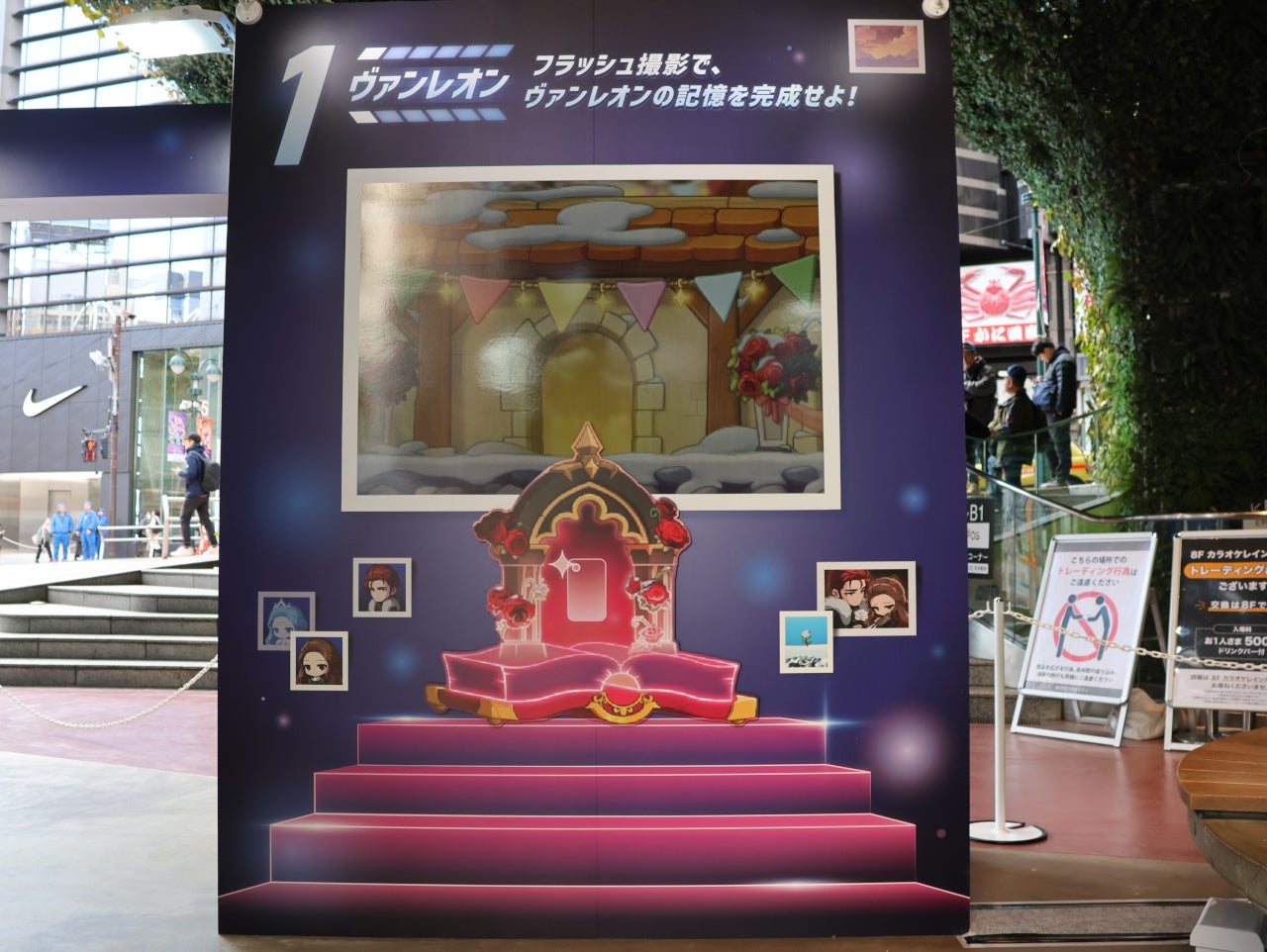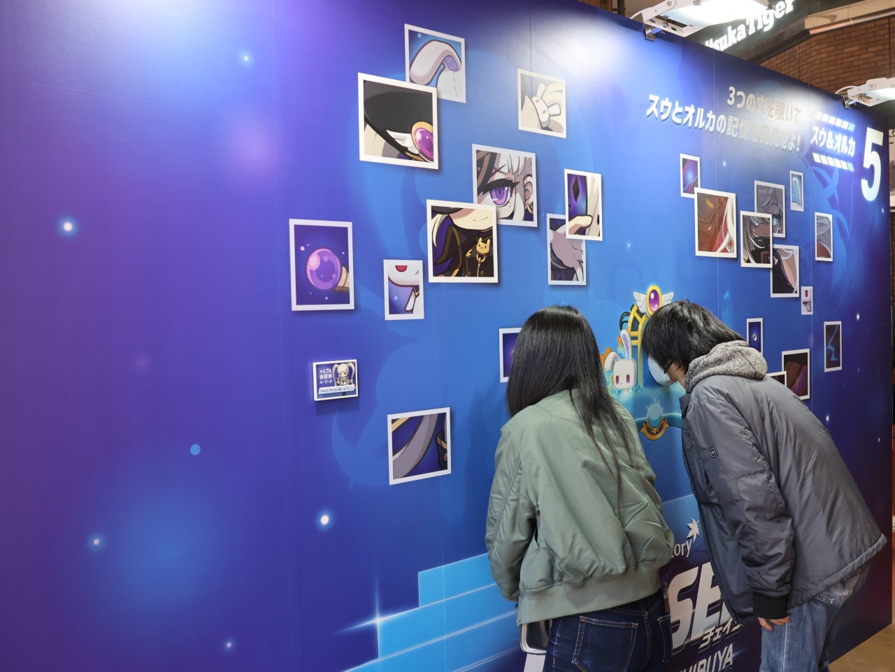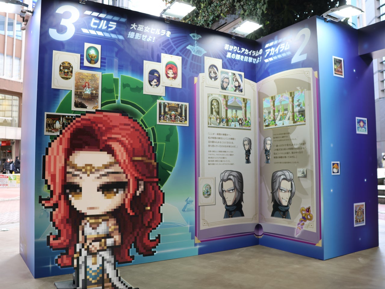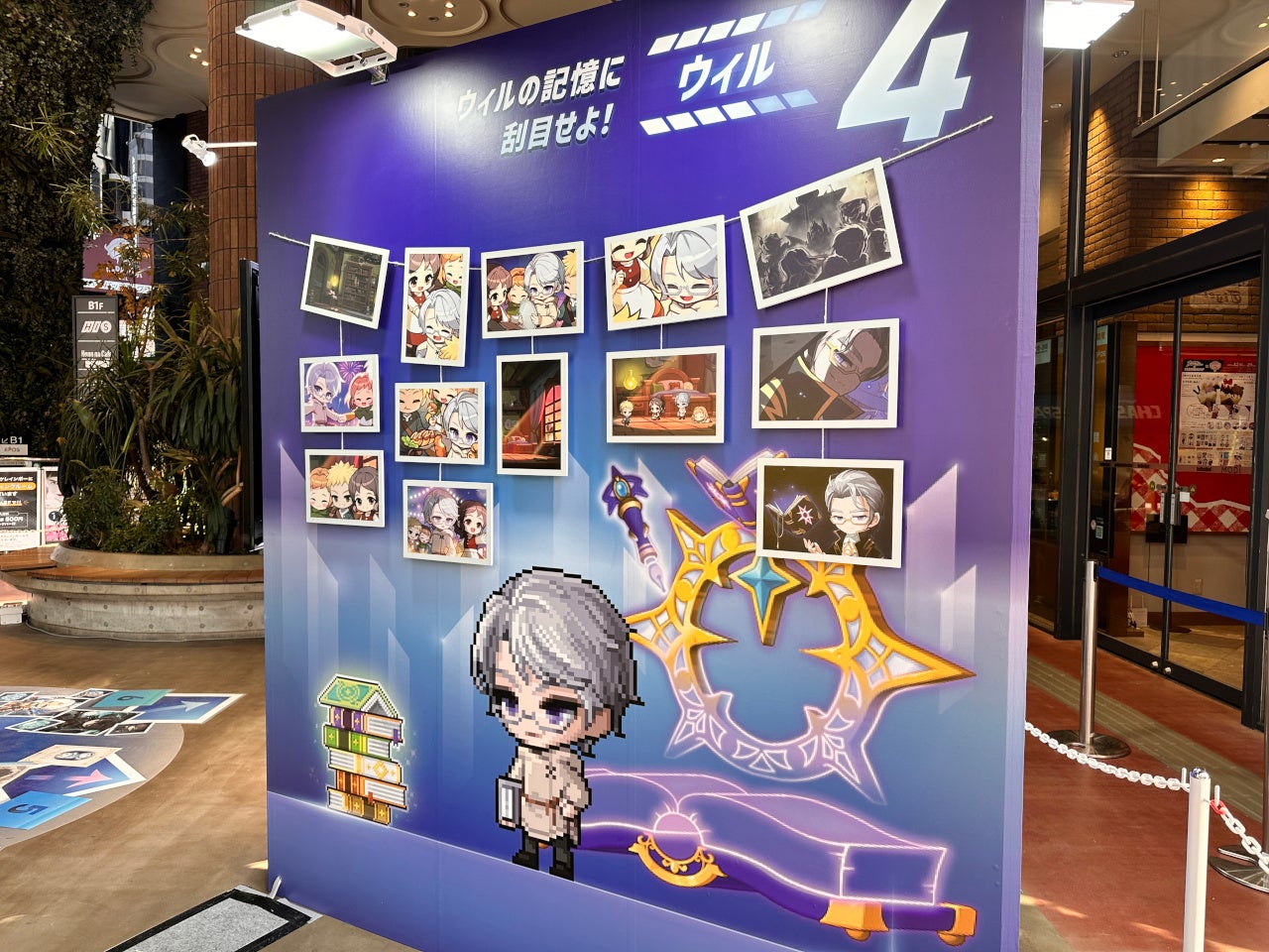 渋谷モディの入口に設けられたイベント会場には、冬の大型アップデート「CHASER」に登場するキャラクター「オルカ」、職業リマスターを実施した「アラン」と「隠月」をはじめ、「CHASER」アップデートの様々なビジュアルを配したゲートを設置し、ご来場の皆様をお出迎えしています。また会場内のフロアには、「CHASER」イベントのストーリーにちなんで、次元の図書館の本をデザインした各展示へのガイドも設置しています。