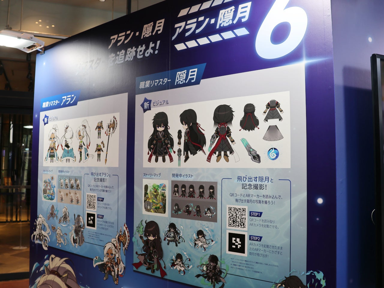 「CHASER」アップデートでリマスターされたアランと隠月のラフ画像など、ここでしか見られない貴重な資料を展示しています。また、QRコードとマーカーをスマホのカメラで読み取ると、飛び出すアラン&隠月の写真が撮れる、ARフォトスポットもお楽しみください。
