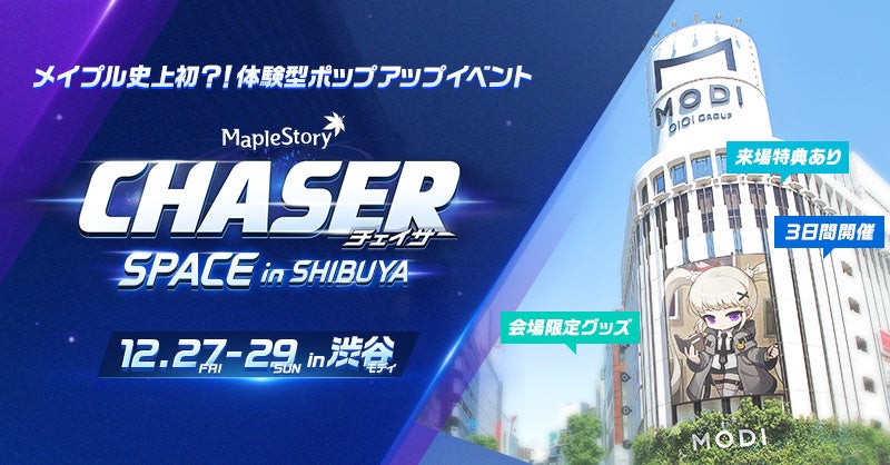 オンラインゲームの制作及び運用を行う株式会社ネクソン(本社:東京都港区、代表取締役社長:李 政憲/イ・ジョンホン、東証:3659、以下 ネクソン)は、2024年12月27日(金)、PC向けオンラインMMORPG『メイプルストーリー』の体験型ポップアップイベント「MapleStory CHASER SPACE in SHIBUYA」を、渋谷モディ(東京都渋谷区)を会場に期間限定でオープンいたしました。