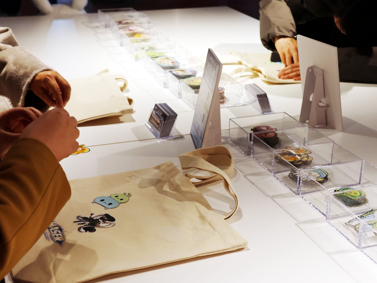 「メイプル工房」では、Tシャツまたはバッグに、お好きな『メイプルストーリー』のステッカーを貼ることで、自分だけのオリジナルグッズを作ることができます。各GMが作成したTシャツ、バッグのサンプルを参考にしながら、皆様思い思いのデザインでグッズを作成していました。
