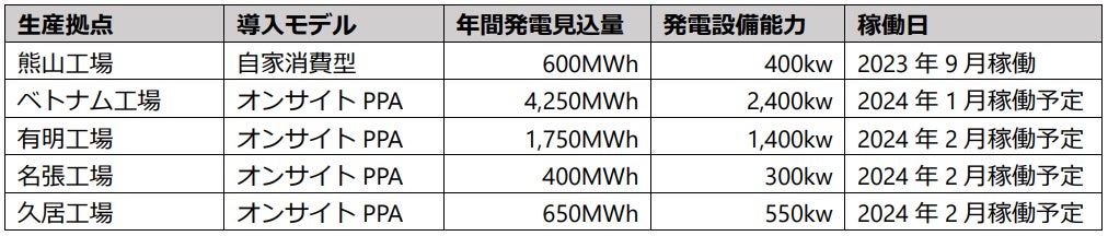 熊山工場に自家消費型の太陽光発電設備が稼働したほか、4拠点にオンサイト型PPAモデルを採用