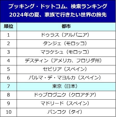 「すべての人に、世界をより身近に体験できる自由を」を企業理念に、多種多様な宿泊施設や旅ナカ体験、旅行中のシームレスな移動手段を提供する世界最大級の宿泊予約サイト Booking.comは、今年の夏の旅行シーズン(2024年6月1日~2024年9月1日のチェックイン予約)を検索対象期間に、世界の旅行者が子どもを含む家族連れの旅行を計画する際、ブッキング・ドットコムのサイト上で宿泊検索をした旅先を調査*し、最も注目されている旅先をランキング形式で発表します。その結果、検索ランキングの7位に東京がランクインしました。