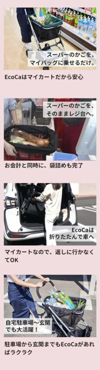 買い物の際 店舗のカートを戻す手間を解決する商品として2021年11月に販売を開始した『EcoCa』は、今まで当たり前とされてきたスーパーの買い物の不便・不満に向き合い、「スーパーの買い物中の不便をなくしたい」という、開発担当者の想いから生まれた折りたたみ式の買い物カート。その便利さは日本の買い物の常識を覆す、まさに“お買い物革命”です。