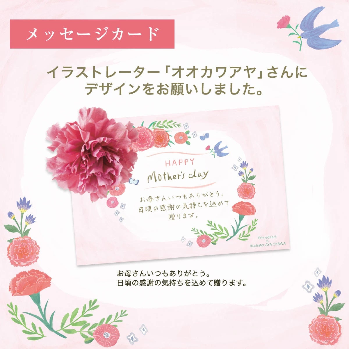 今回のEcoCa母の日キャンペーンでは、イラストレーターのオオカワアヤさん書き下ろしのオリジナルメッセージカードをお付けいたします。ありがとうのカードを添えて、EcoCaを贈りませんか?