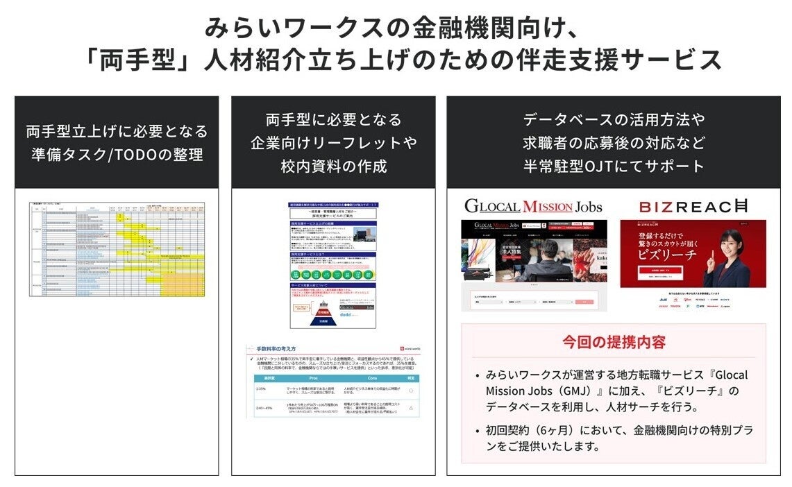 今回の提携により、当社の連携する地域金融機関が、ビズリーチ社が運営する即戦力人材と企業をつなぐ転職サイト『ビズリーチ』を活用し、幹部候補・リーダー候補などの中堅レイヤー層の人材紹介も推進できるようにサポートいたします。また、地域金融機関が、人材紹介事業として『ビズリーチ』を利用する際に、初回契約(6ヶ月)において、金融機関向けの特別プランをご提供いたします。