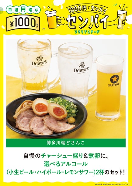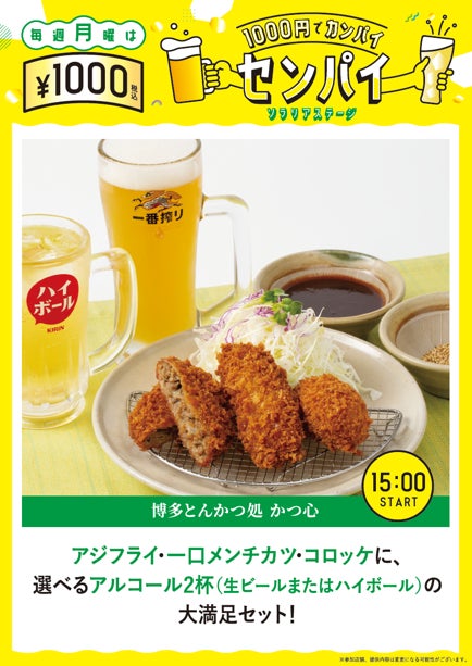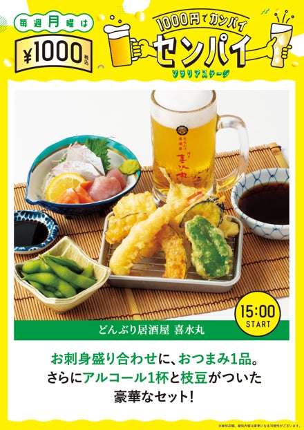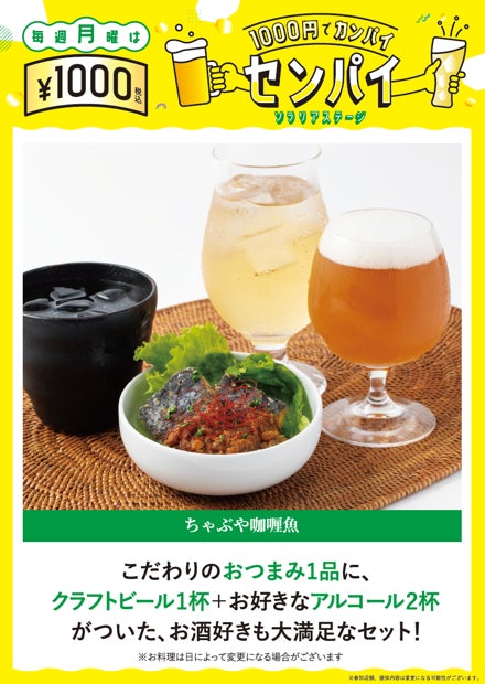 「センパイ」は1,000円で乾杯の略語であり、館内飲食店舗計21店舗にて税込み1,000円でお酒とおつまみをお楽しみいただける企画となっております。