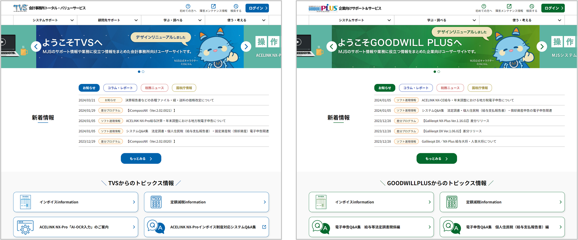 財務・会計システムおよび経営情報サービスを開発・販売する株式会社ミロク情報サービス(本社:東京都新宿区、代表取締役社長:是枝 周樹、以下「MJS」)は、MJSの製品・サービスをご利用いただいている会計事務所のお客さま向け経営情報サイト「TVS(Total Value Service)」(https://tvs.mjs.co.jp/)と、企業のお客さま向け運用支援サイト「GOODWILL PLUS」(https://goodwill.mjs.co.jp/)について、デザインリニューアルを実施したことをお知らせいたします。