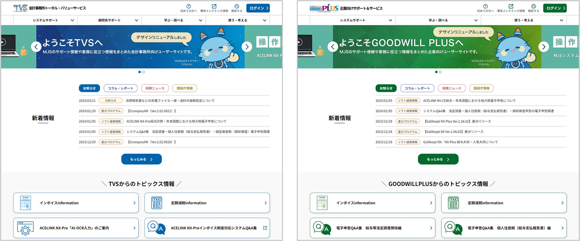 MJSは、全国約8,400の会計事務所と、約10万社の中堅・中小企業のユーザーさまを有しており、お客さまにとって心地良い顧客体験(CX)※1の提供と、お客さまを成長や成功に導くカスタマーサクセス※2の実現に向け、各種施策に取り組んでいます。その一環として、この度、製品・サービスのサポート情報と実務に役立つ情報を提供するユーザーさま向けサイトのデザインリニューアルを実施しました。