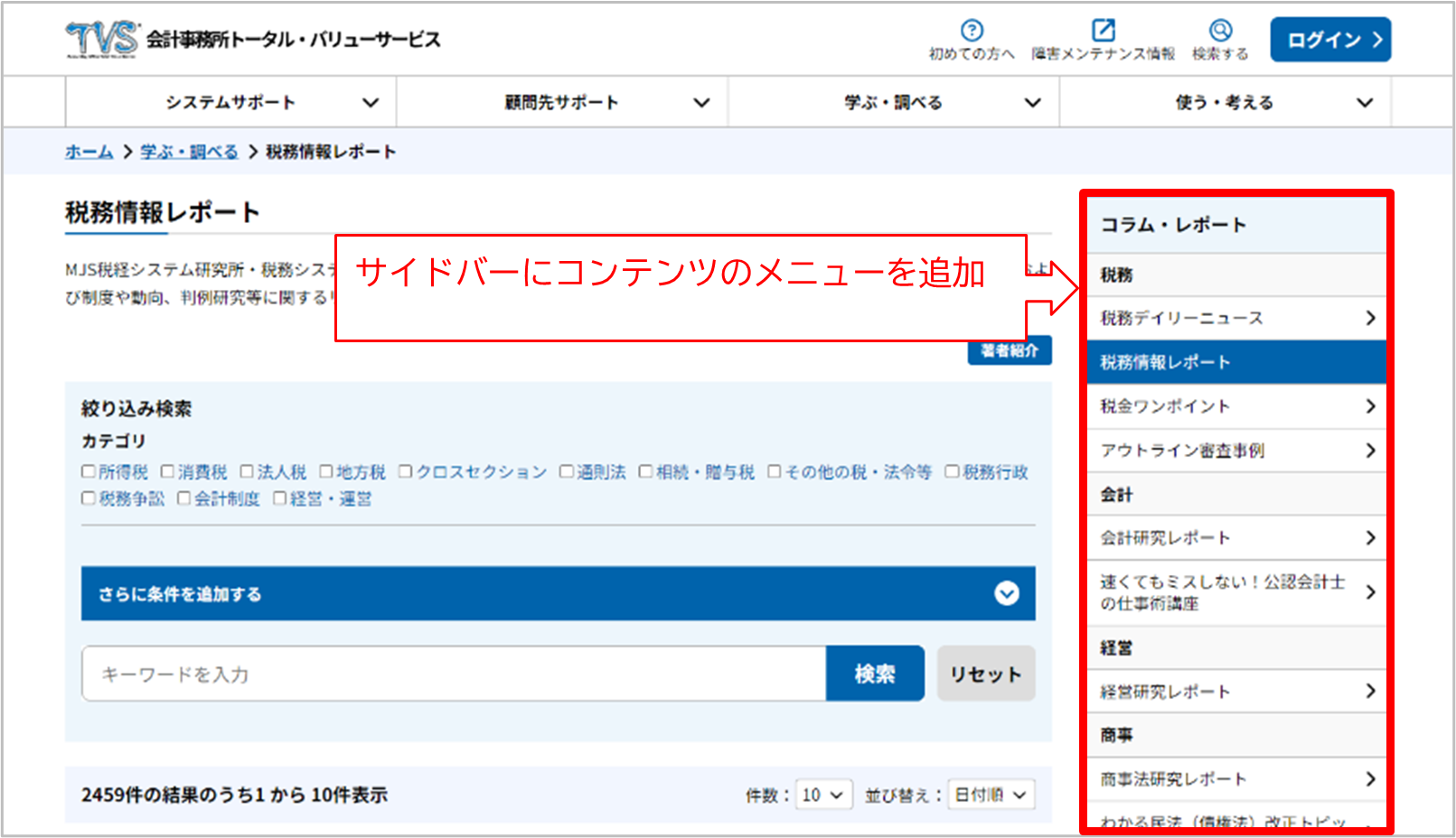 「TVS」はMJSシステムをご利用の会計事務所ユーザーさまに対し、システムサポート情報をはじめ、税務や経営等の会計事務所実務に役立つ情報、顧問先指導に役立つ情報、さらには業務テンプレートや書式・文例集など、豊富な経営ノウハウと経営情報サービスを提供するサイトです。