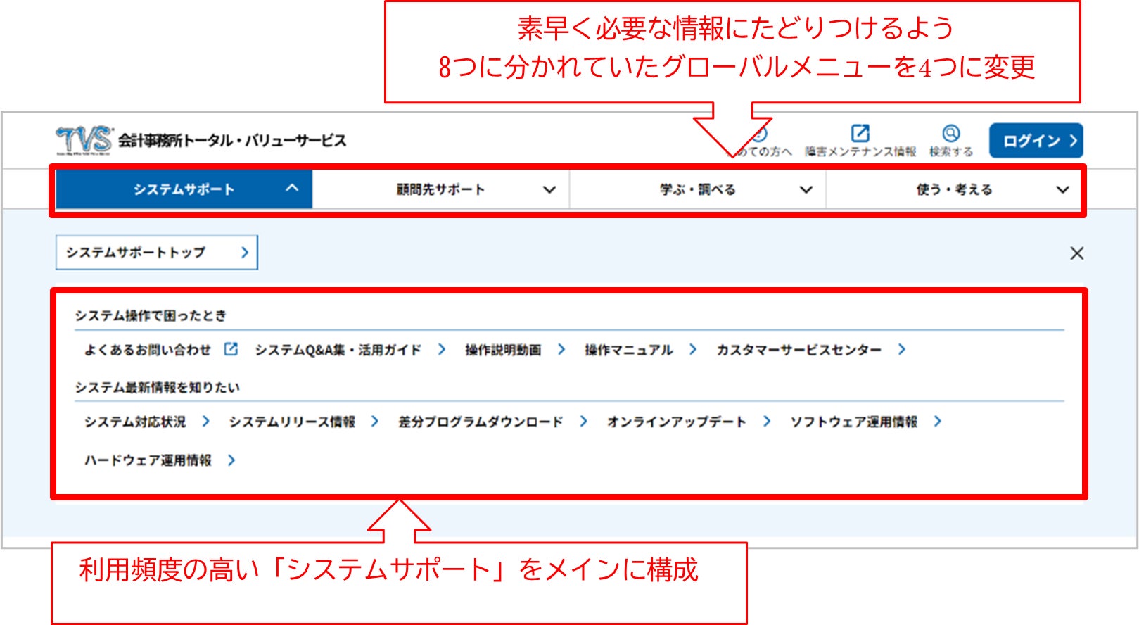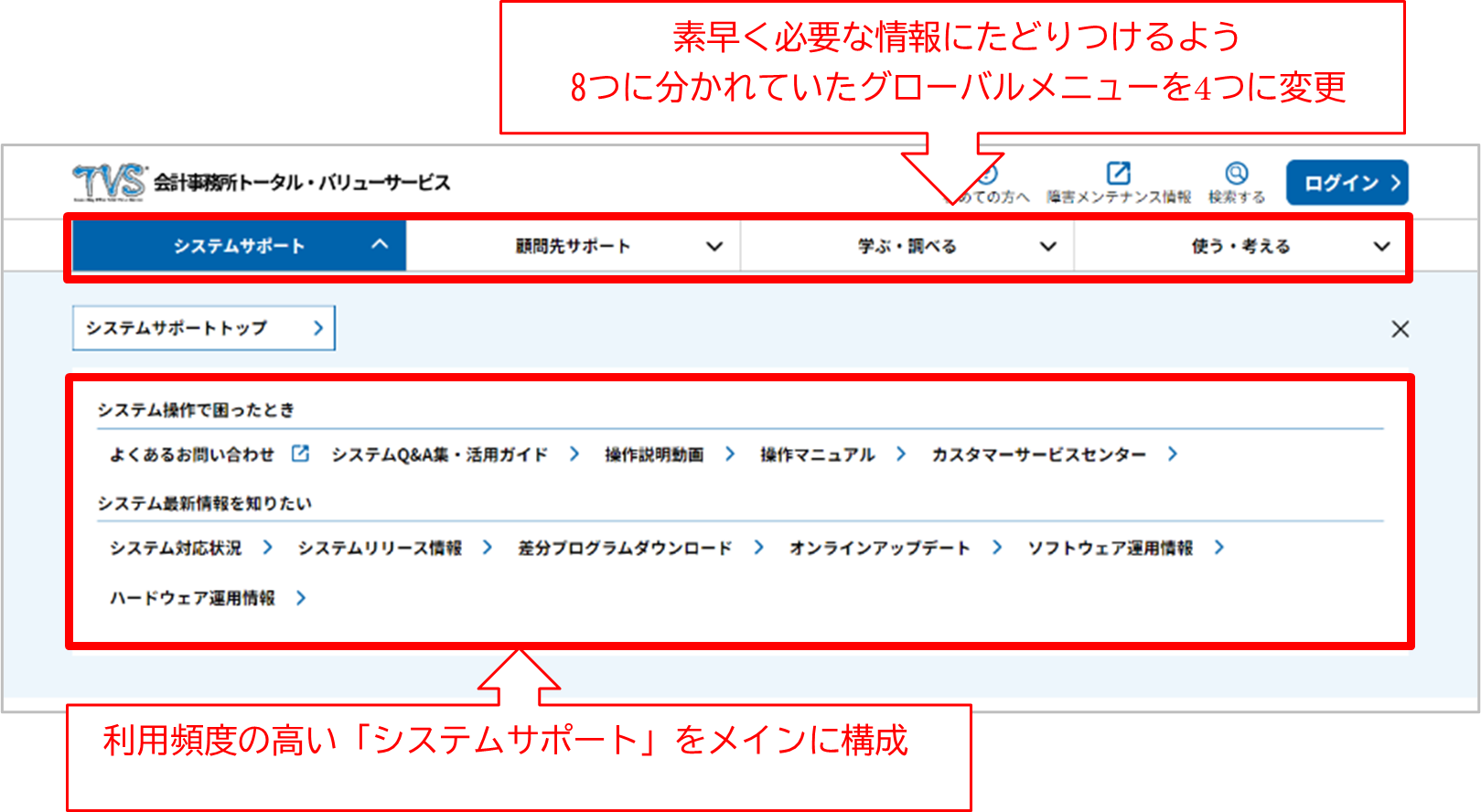 トップページは、サイドバーを無くして縦一列のページ構成に変更し、利用率の高いシステムサポートに関するコンテンツをメインにした、シンプルなレイアウト構成としています。また、お客さまが迷いなく必要な情報にたどりつけるようグローバルメニューは最小限にまとめました。
