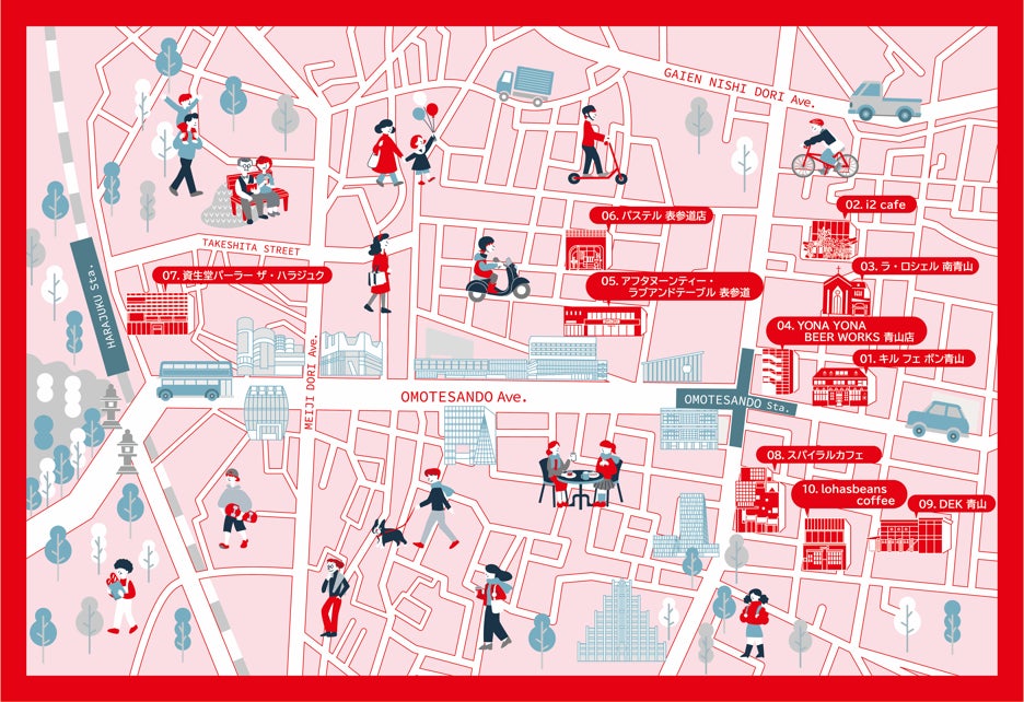 ■店舗:「キル フェ ボン青山」、「i2 cafe」、「ラ・ロシェル南青山」、「YONA YONA BEER WORKS 青山店」、「アフタヌーンティー・ラブアンドテーブル 表参道」、「パステル 表参道店」、「資生堂パーラー ザ・ハラジュク」、「Spiral Café(スパイラルカフェ)」、「DEK 青山」、「lohasbeans coffee」