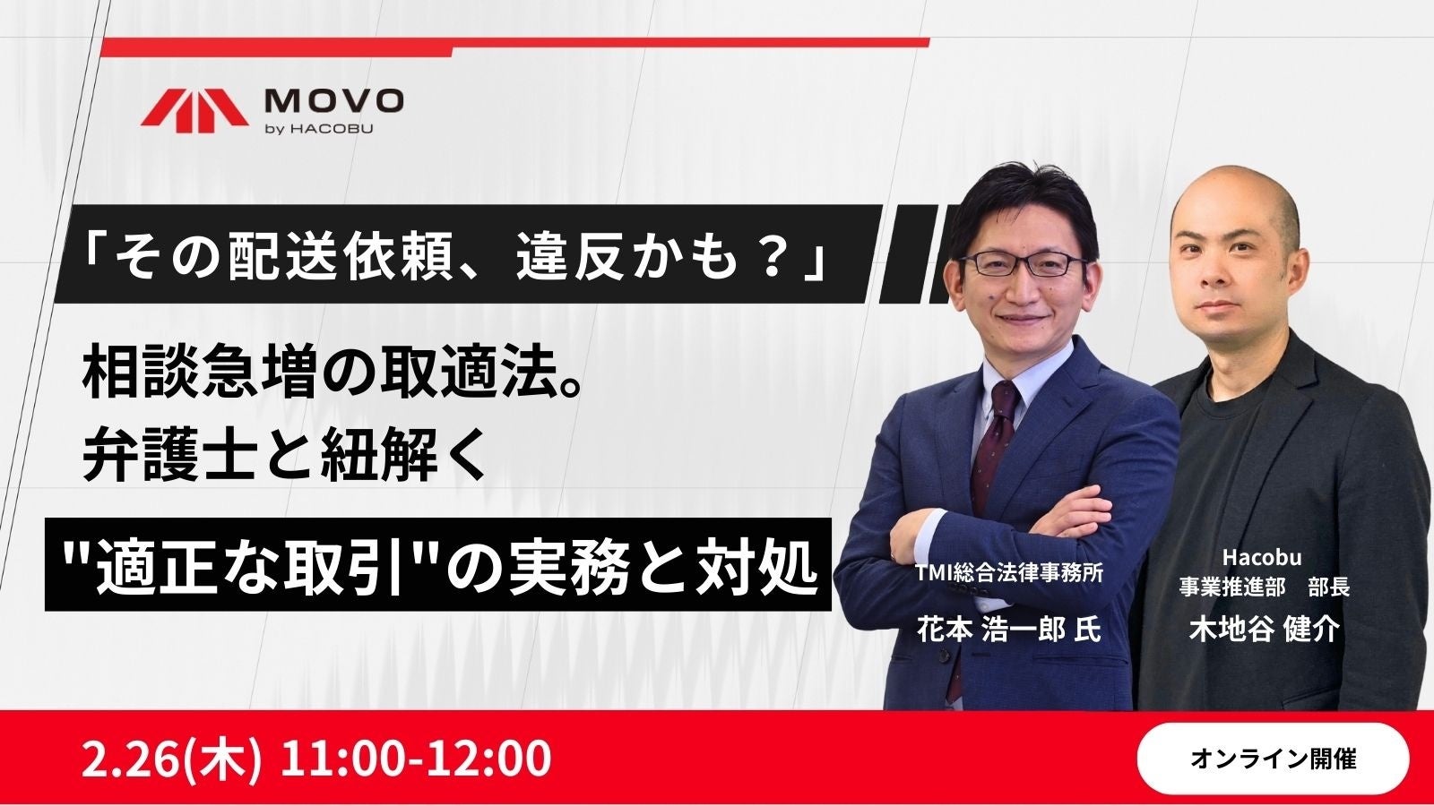 データの力で物流課題を解決する株式会社Hacobuは、2026年2月26日、「その配送依頼、違反かも?弁護士と紐解く適正な取引の実務と対処方法」と題し、オンラインセミナーを開催いたします。