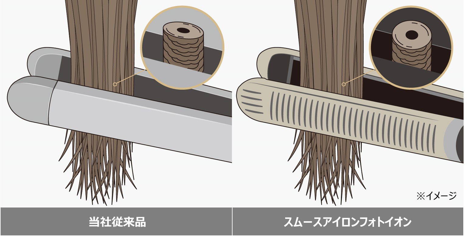 髪の表面に付着する水分が高温プレートにあたり、瞬時に蒸発すると、キューティクルにダメージを与えてしまいます。プレートの中心に切り込みを入れることにより、水蒸気を外部へ逃がし、髪へのダメージを防ぎます。