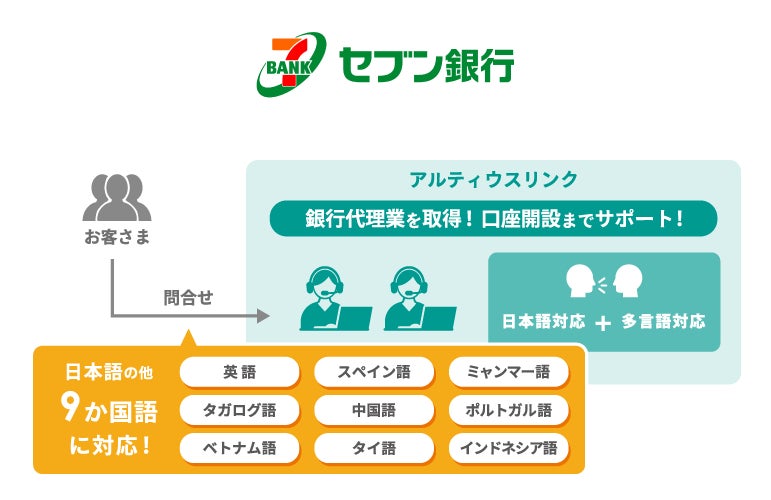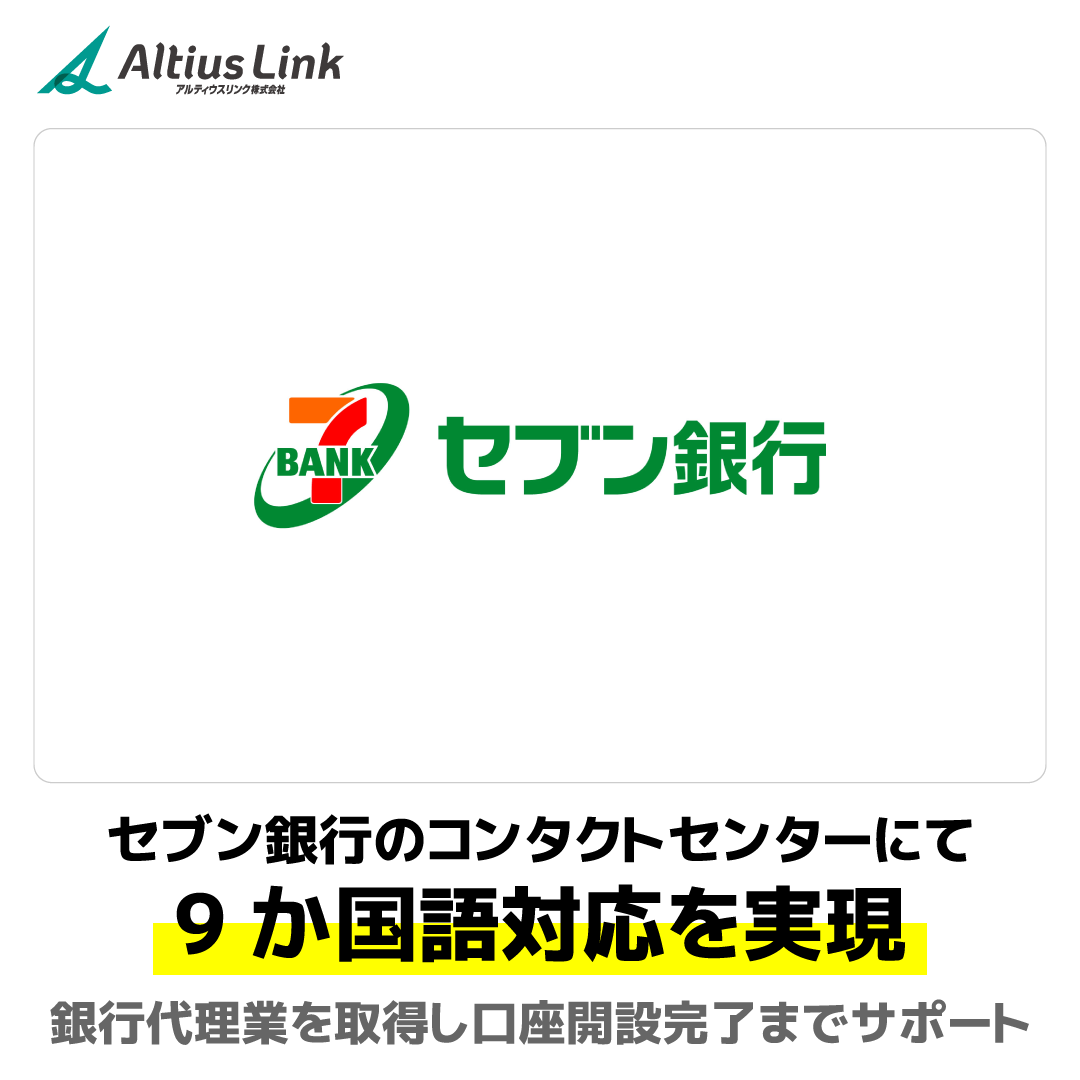アルティウスリンク株式会社(所在地:東京都渋谷区、代表取締役社長:網野 孝、以下 アルティウスリンク)は、株式会社セブン銀行(所在地:東京都千代田区、代表取締役社長:松橋 正明、以下 セブン銀行)の多言語対応コンタクトセンター運営を実現した好事例を公開しました。外国語需要が拡大する中で9か国語に対応し、さらには銀行代理業の資格を活かした口座開設サポート体制を実現しました。