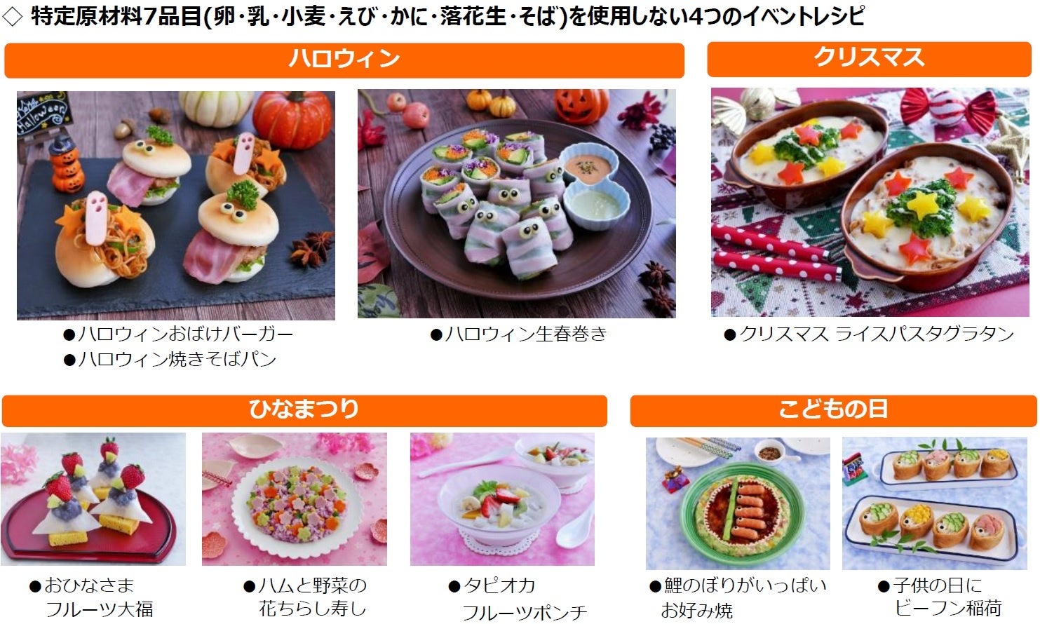 プロジェクトAでは、食物アレルギー配慮商品を買い求めやすい環境づくりに向け、5社協同での営業提案活動を行っています。その一環として、売り場づくりに求められるような季節のイベントで活用できる「イベントレシピ」を新たに9品開発しました。レシピは各社ホームページで公開しています。