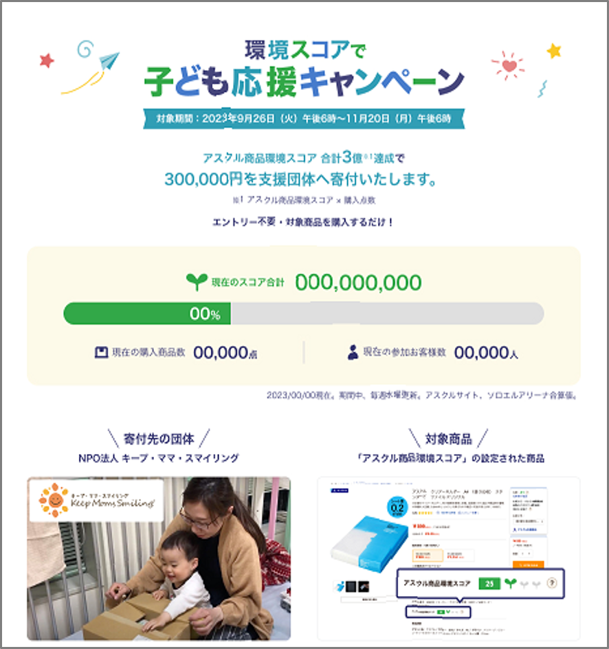 今回新たな試みで、商品毎に付与されたアスクル環境スコアと期間中の商品購入数を掛け合わせて合算スコアを算出し、アスクル環境スコアが合計3億スコア達成で、売上の一部を病気の子どもとその家族を支援するNPO法人キープ・ママ・スマイリングへ寄付します。