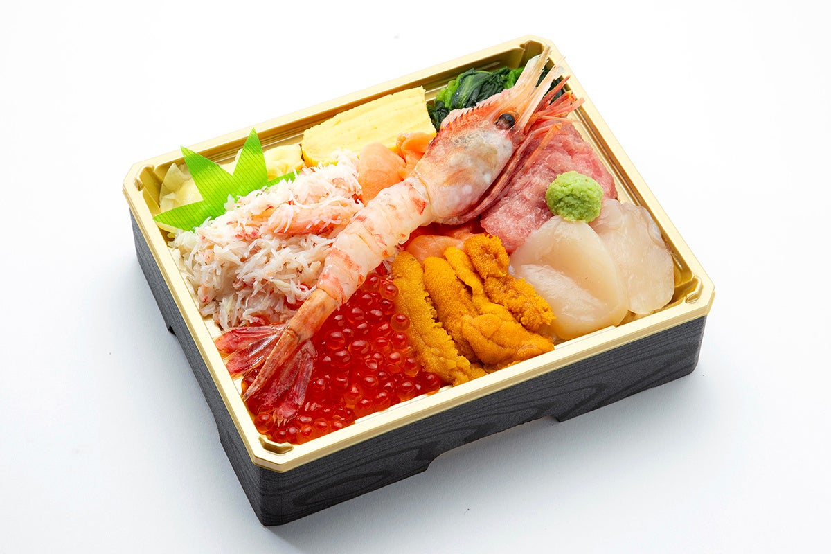 濃厚な甘みのホタテ「湾宝(わんぽう)」をはじめ、いくら、ボタンエビ、かに、うになどが一気に楽しめる、季節限定の一折です。