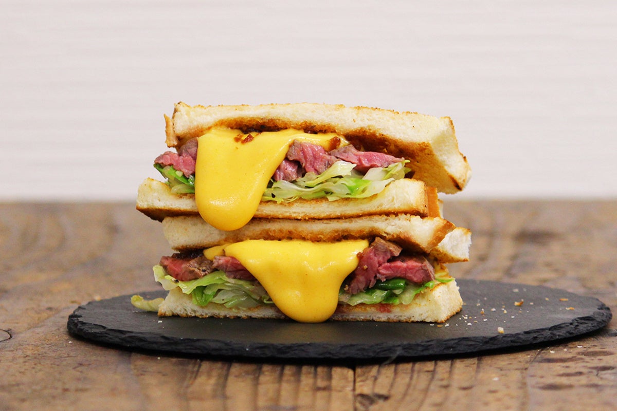 野菜フレークで知られる「大望」のじゃがいもフレークを使用したマッシュポテトにチェダーチーズを合わせたチーズポテトと、道産交雑牛のステーキを挟んだサンドイッチ。