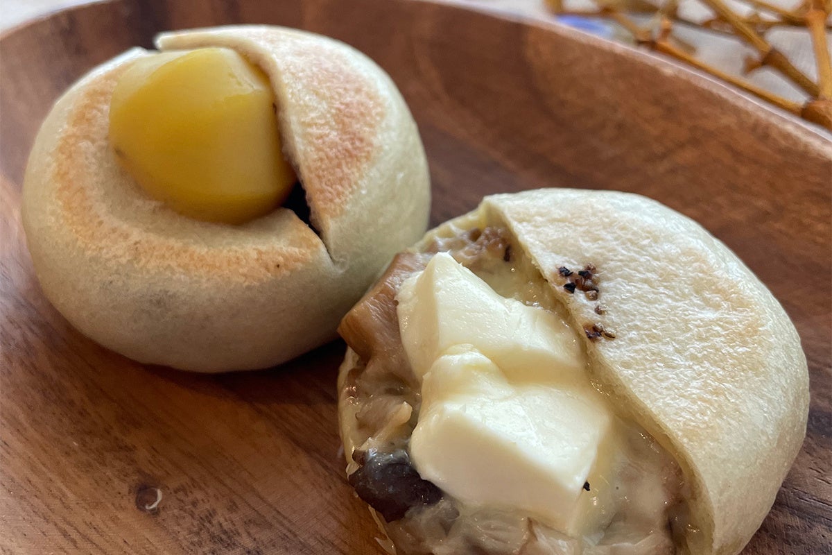 ●〈円山おやき満月屋〉満月おやき、きのこチーズおやき 各530円