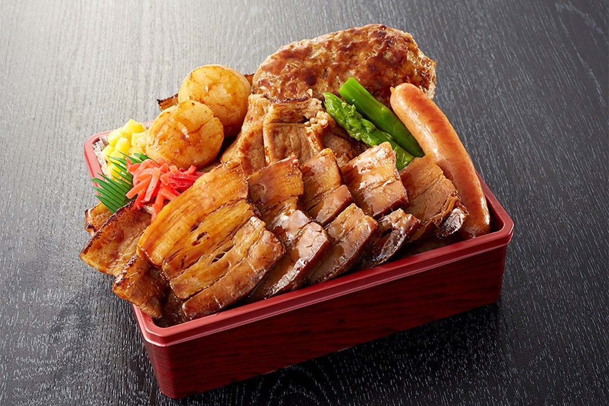 十勝産の厚切りロース肉を網焼きにし、ハンバーグ、角煮に道産貝柱も入れた大満足のボリューム弁当です。
