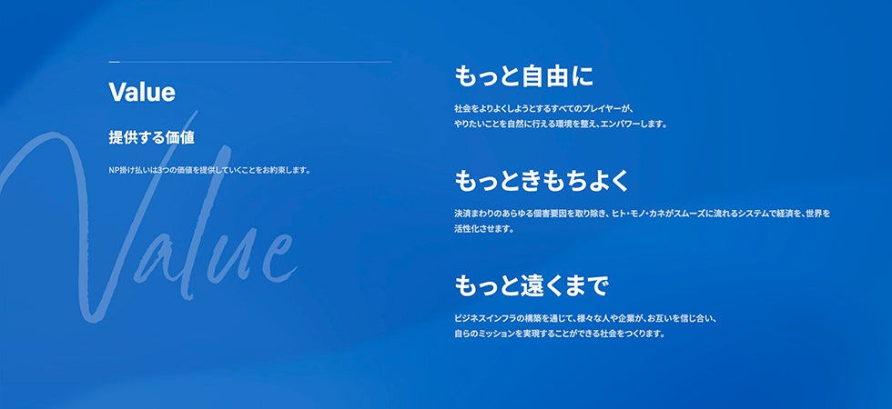 ブランドサイトを通して「NP掛け払い」が提供する価値や大切にするフィロソフィーをお伝えしていくとともに、サービスの提供を通して社会の変化や様々な商取引に対応しながら、企業活動に伴うあらゆる決済関連の障壁の解消とビジネスの可能性の最大化に努めてまいります。