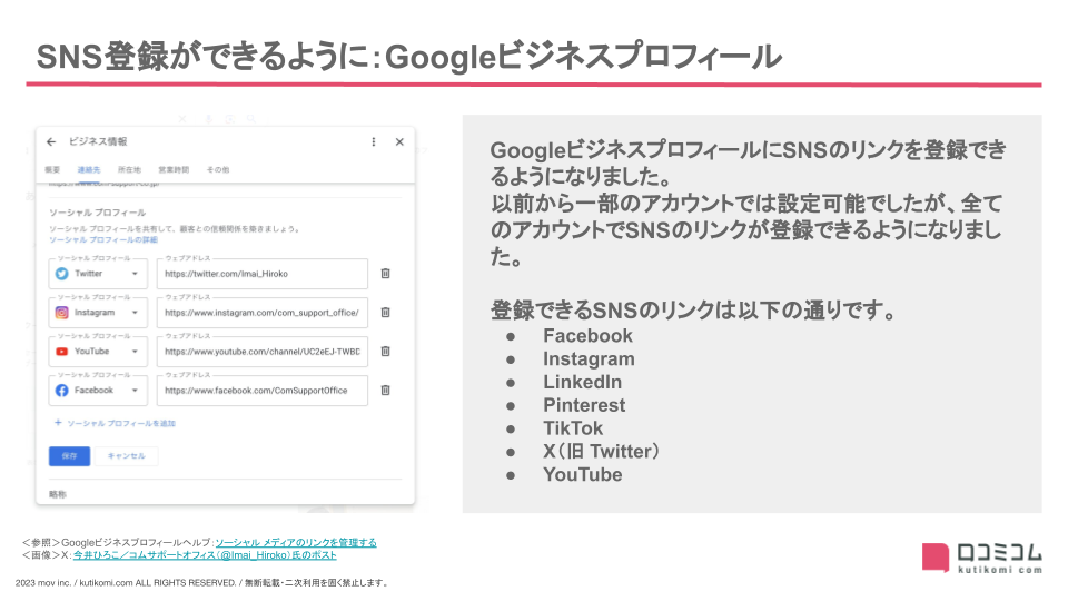 GoogleビジネスプロフィールでSNS登録が可能に:最新の「Googleマップ・MEO」情報レポート【2023年9〜10月版】を口コミコムが公開