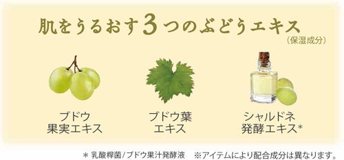 保湿成分:ブドウ果実エキス、ブドウ葉エキス、シャルドネ発酵エキス(乳酸稈菌/ブドウ果汁発酵液)、ローヤルゼリーエキス、アロエベラ葉エキス