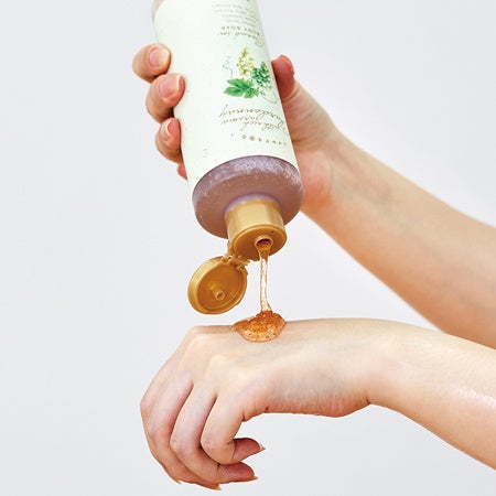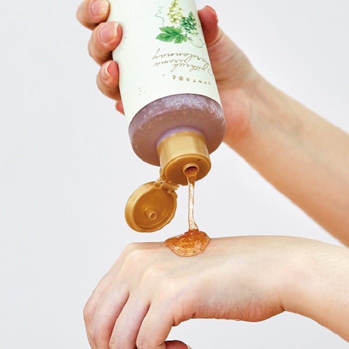 3つのぶどうエキスとローヤルゼリーエキス、アロエベラ葉エキスを配合。クルミ殻*のスクラブが肌の汚れや古い角質を穏やかに落とし、肌をやわらかく整えながらもっちりすべすべ肌に。天然由来成分95%(水を含む)配合。