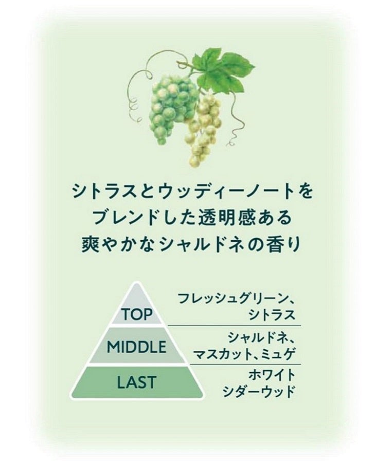 果汁味あふれるみずみずしいシャルドネアロマが大好評のフレグランス&バスシリーズ『シャルドネ』。