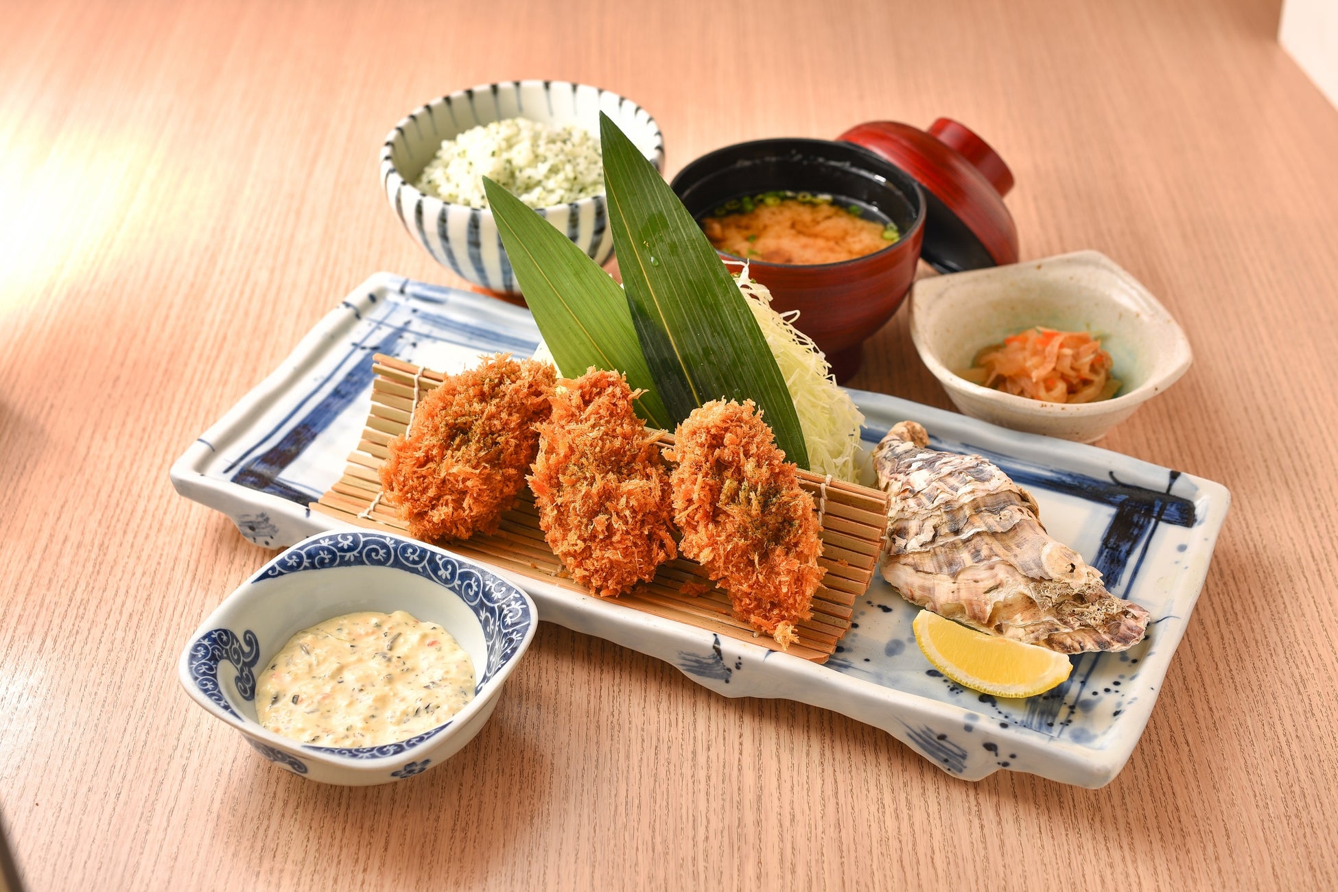 とんかつ、和食の専門店武蔵総本店(同市藤沢町)は、豊橋特産の「大葉」を栽培している㈲州田園(しまだえん、同市老津町)の商品、「大葉粉末」や、塩と合わせた「大葉塩」、「大葉胡椒」を活用。これからが旬のカキフライに使いました。