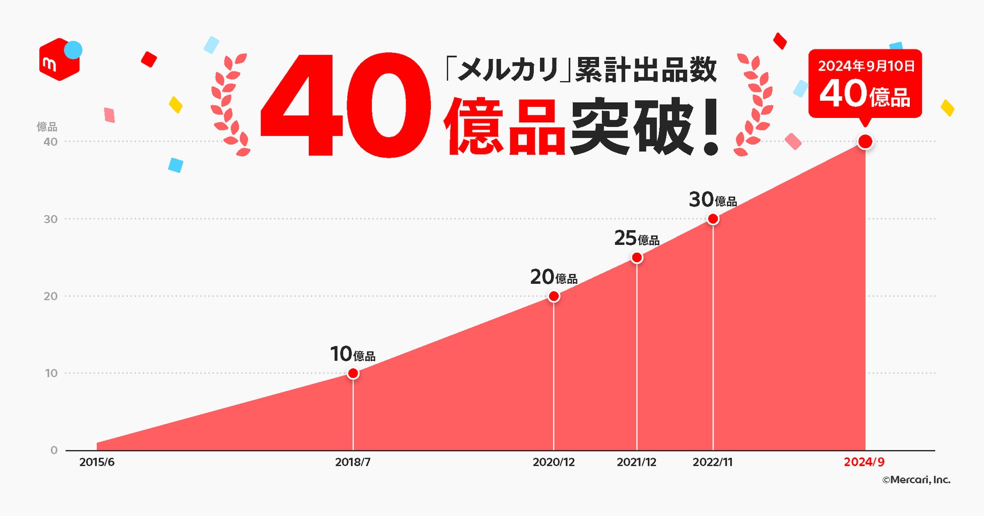 株式会社メルカリ(以下:メルカリ)は、「メルカリ」の累計出品数が2024年9月10日に40億品(※1)を突破いたしましたのでお知らせいたします。この数字は、2013年7月のサービス開始から約11年で達成いたしました。