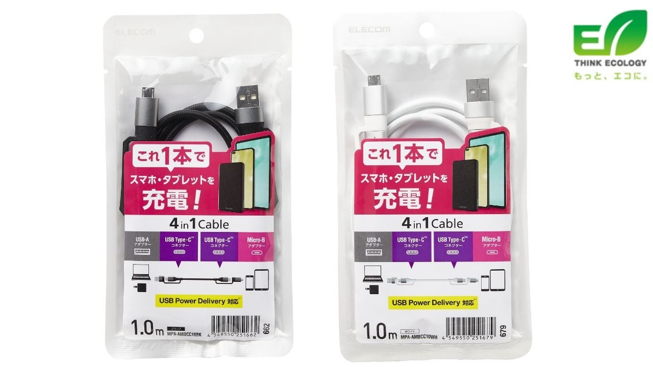 エレコム株式会社(本社:大阪市中央区、取締役社長:柴田幸生)は、機器に合わせてコネクターを付け替えられる4in1 USBケーブルを7月上旬より新発売いたします。