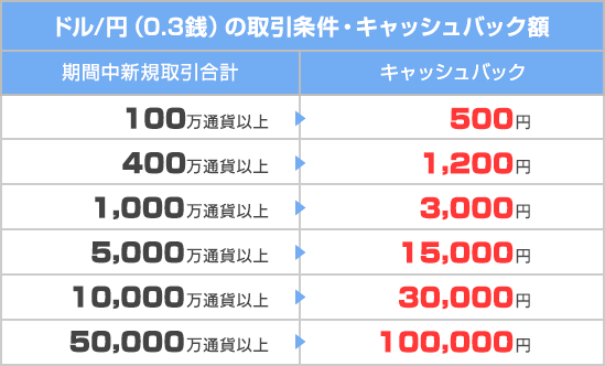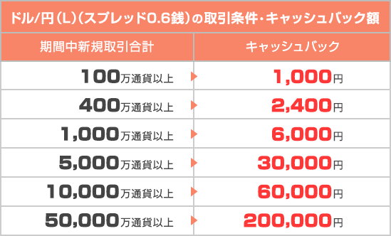 達成されたお客様にキャッシュバックいたします。 さらに、『選べる外貨』におけるドル/円(L)において、同じ取引条件を達成されたお客様には、キャッシュバック額を2倍へアップにいたします。詳細は下記にてご確認ください。