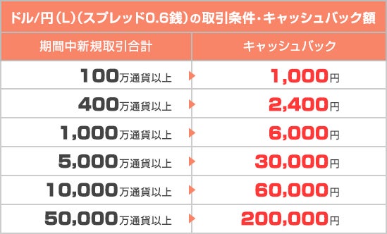 本キャンペーンでは、キャッシュバックキャンペーン対象期間中の外国為替保証金取引(FX)『選べる外貨』における、ドル/円とドル/円(L)の新規取引数量に応じてキャッシュバックいたします。本キャンペーンにお申し込みいただき、取引条件を満たしたお客様全員がキャッシュバックの対象となりますので、ぜひこの機会に『選べる外貨』でのお取引をご検討ください。