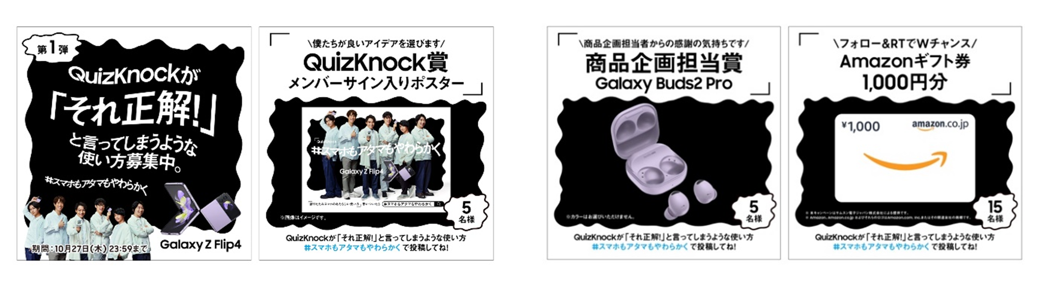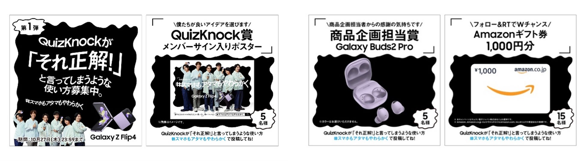 さらに、2022年11月4日 (金)には、集まったアイデアをQuizKnockさんが選定する「ドラフト会議」をGalaxy公式YouTubeチャンネルにて生配信予定※2です。あなたのアイデアが選ばれる感動の瞬間を一緒に味わいましょう!選定されたアイデアは、Quizknockさん自ら企画・撮影し、折りたたみスマホの新しい使い方動画として、後日Galaxy公式YouTubeチャンネル内で公開させていただく予定です。