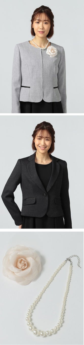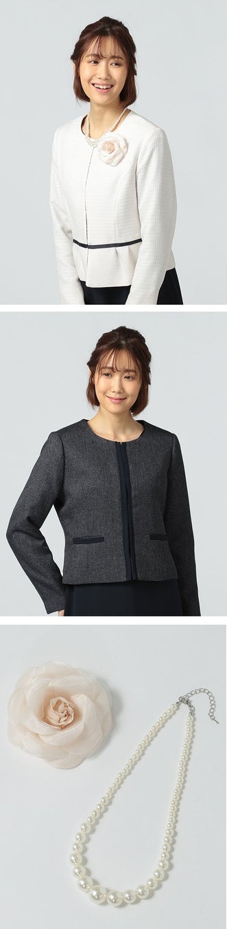 セット内容:配色ノーカラージャケット、同色テーラードジャケット、ワンピース、コサージュ、ネックレス