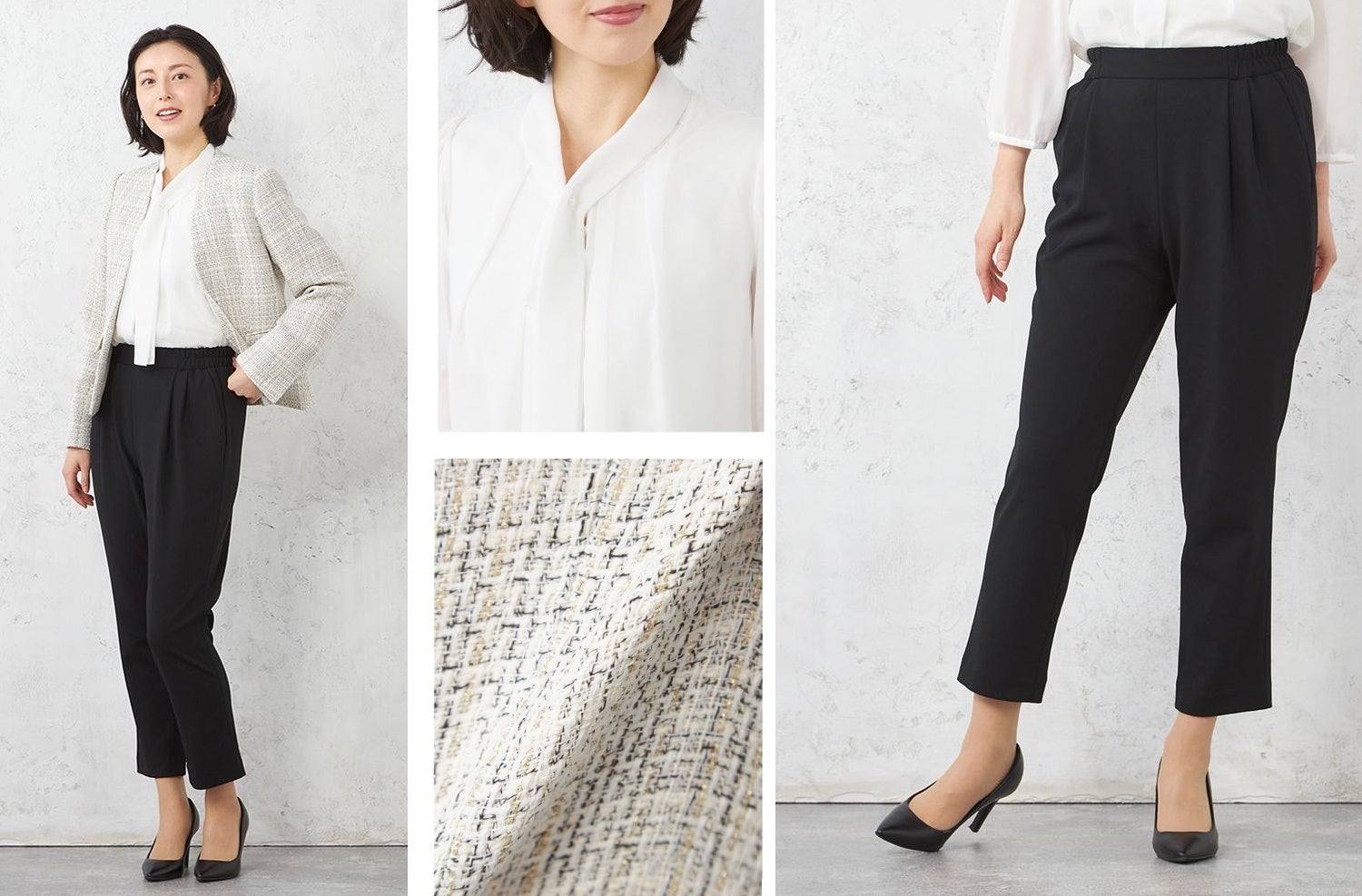 カラー:ベージュ(ジャケット)、ブラウス(ホワイト)、パンツ(ブラック)