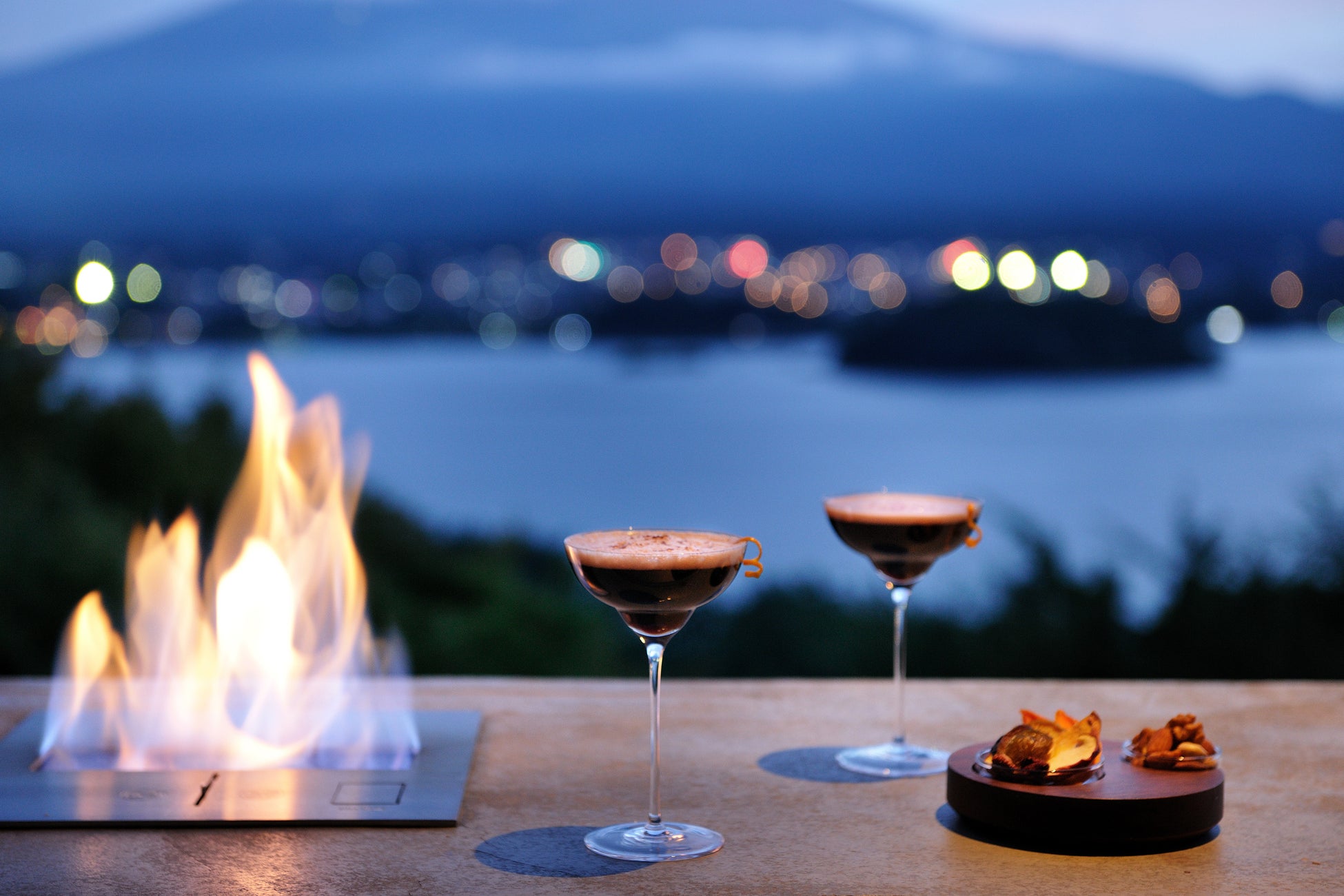 ルームサービスの夕食を楽しんだ後は、「夕食後の一杯」として、コーヒーカクテルをキャビンで楽しみます。キャビンのテラスで、ファイアープレイスの炎が揺れるのを眺めながら赤ワインとコーヒーのカクテルを楽しみ、1日の滞在を締めくくります。