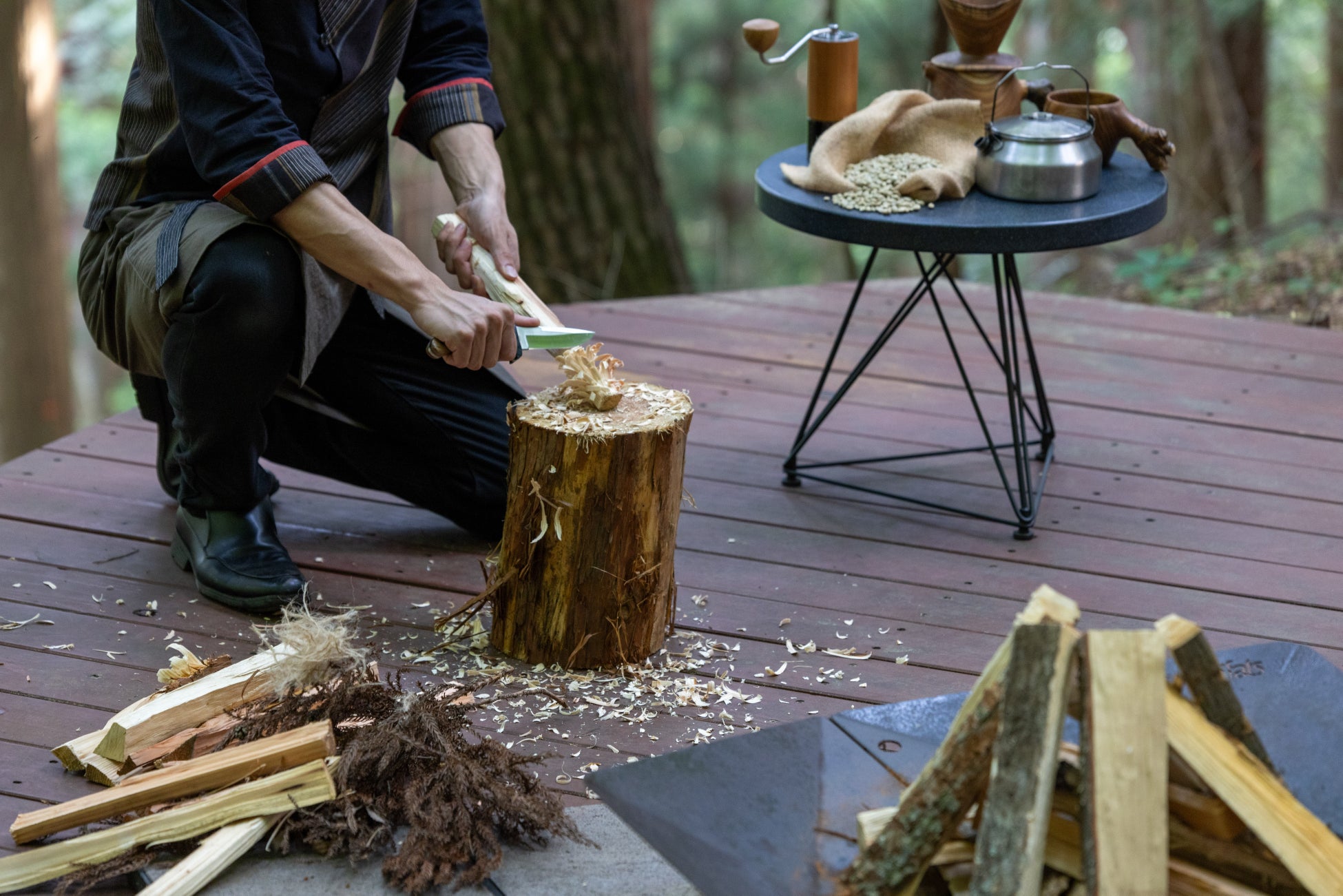 13:15 グランピングマスターとともに「焚き火熾し」をする