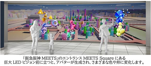 「阪急阪神 MEETS」のエントランスのMEETS Squareにある巨大 LED ビジョンの前にお客さまが立つと、LEDビジョン内にアバターが現れ、さまざまな色や形に変化し、架空の“まち”の一部として取り込まれていきます。アバターが建物や樹木となり“まち”が大きくなっていく楽しさや、スペシャルアイテムとして大きくかつシンボリックな建造物に変わる歓びを体験いただけます。これにより、お客さま自身が“まち”を彩り、未来をつくる一部であることを感じていただくことができます。