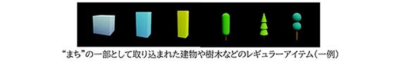 お客さまのアバターが現れ、さまざまな色や形に変化し、架空の“まち”に取り込まれます。