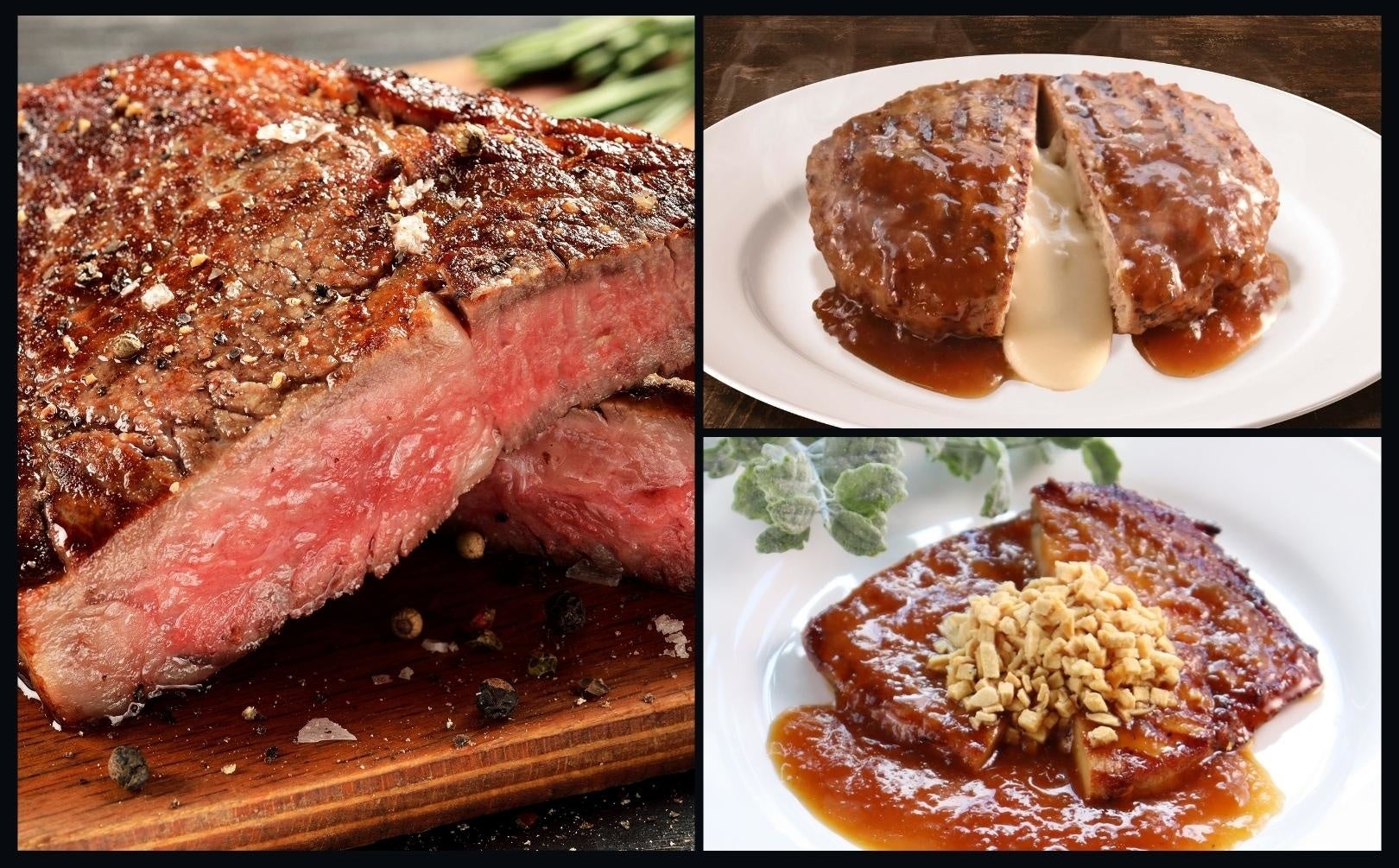 牛肉の中でも脂肪の少ない部位(ログ芯)の赤身を使用し、さっぱりとした美味しさと、噛みしめるたびに肉の香りと強い旨味が口いっぱいに広がる『牛赤身ログステーキ』と、濃厚なソースが絡んで食べ応え抜群の『トンテキ』。